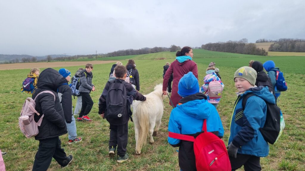 Děti z horní školy se v úterý 31.3.2026 v rámci jarního projektového dne vydaly na farmu do dolní Libiny, kde na ně čekala domácí zvířátka. Děti se dozvěděly zajímavé informace o zvířátkách, ale i o těžké práci na farmě. Skoro celou cestu nás doprovázel neúnavný poník Turbo. Děti měly největší radost z telátek, jehňátek a z velikého stohu balíků slámy. Děkujeme jedné úžasné mamince za možnost navštívit farmu a určitě to nebylo naposledy.